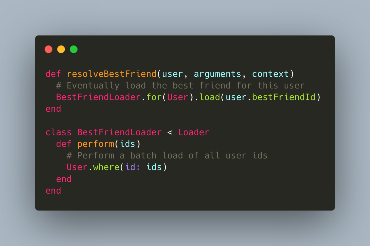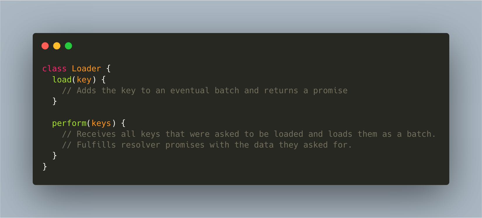 #loadtakes as an argument the loading key for the data the caller is interested in and it returns a promise, which will eventually be fulfilled with the data the caller asked for. This method is used within resolvers#perform(batchFunction) Takes all the accumulated keys that theloadfunction calls added, and loads the data in the most efficient way. This method is usually either defined by us, or calls a batch function we’ve provided.